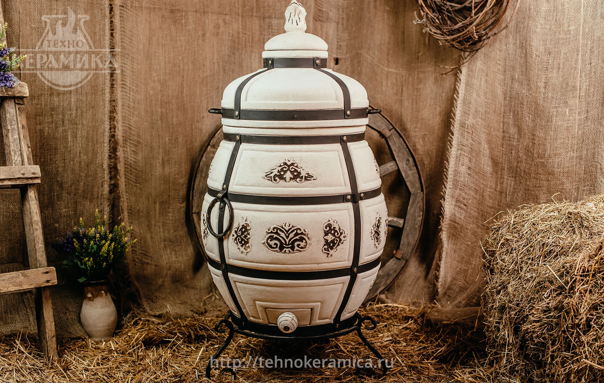 Тандыр "Александр" выполнен в виде округлого бочонка большого объёма. Тандыр имеет крышки двух уровней (колпачок и крышку). Удобно выполненный колпачок, позволяет не терять тепло при открывании тандыра. А крышка с удобными ручками позволяет легко открывать тандыр и закладывать в него продукты для приготовления. Кованная подставка - ножки обеспечивает удобное использование тандыра. Красоту тандыру придаёт интересный орнаментальный растительный узор, расположенный в центральной его части. Керамический тандыр в основном выполнен в бежевом цвете, коричневый цвет добавлен в области орнамента.